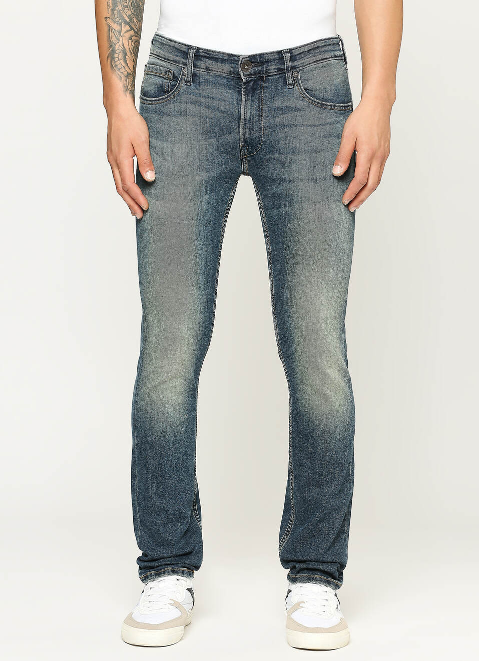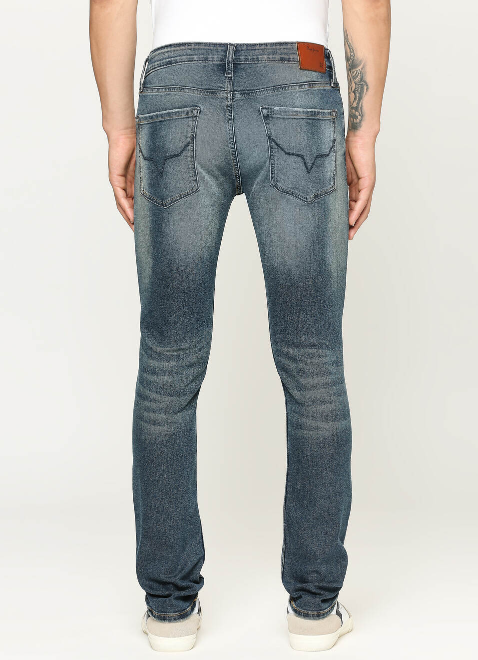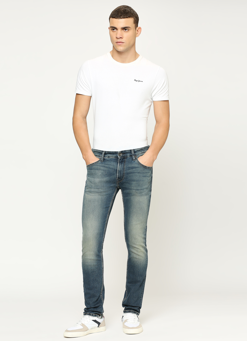 signature brand carrier - stylized 5-pocket skinny fit low rise jeans, charcoal black washed with mild distruction and repair, light highlight and whiskers for a classic looks.