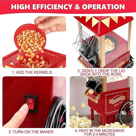 One-button quick operation] is easy to use, just add one or two scoops of dry corn to the popcorn machine, then press the on/off switch to produce popcorn without any other operations. Just wait 2-3 minutes to enjoy delicious popcorn, which is faster and safer than other popcorn.